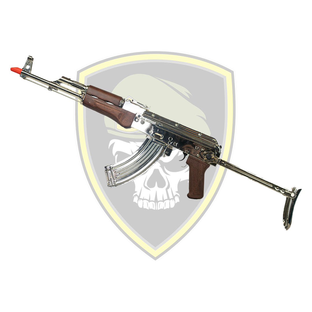 Fit for any dictator, this AKS-47 comes with a silver finish that's near blinding, and a real wooden handguard. Almost every external metal component has a very nice silver finish. This blaster has a head turning magnet pre-installed. The buttstock can be folded to provide a tight, compact CQB setup.